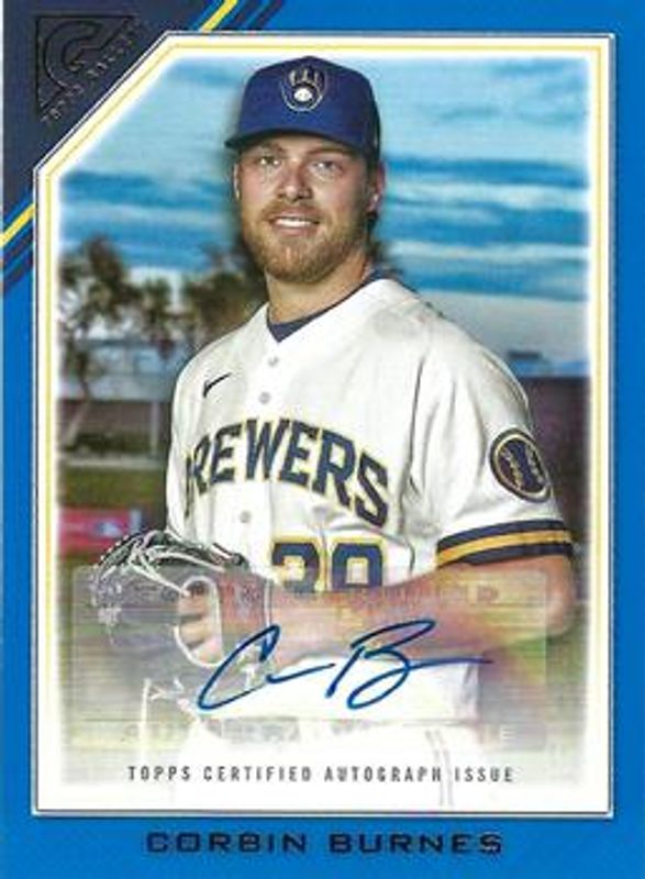 The Corbin Burnes 2021 Topps Gallery #VA-CB Veterans Autographs - Blue /50 card is 1 of 21 Corbin Burnes' card variations in the 2021 Topps Gallery set being tracked by Sports Card Investor, including Base, Printer Proof, Rainbow Foil, Private Issue /250, and Green /125.