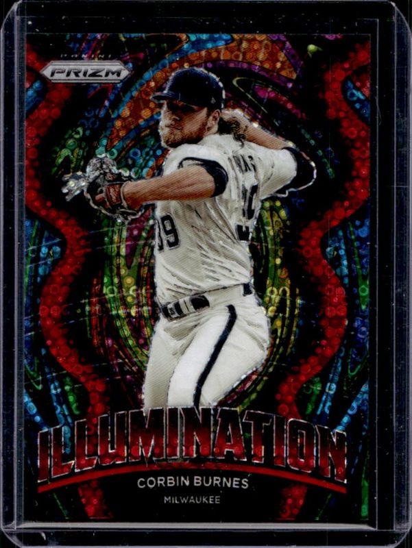 The Corbin Burnes 2022 Prizm #IL-4 Illumination - Red Donut Circles /99 card is 1 of 80 Corbin Burnes' card variations in the 2022 Prizm set being tracked by Sports Card Investor, including Base, Blue, Blue Velocity, Carolina Blue, and Cosmic Haze.