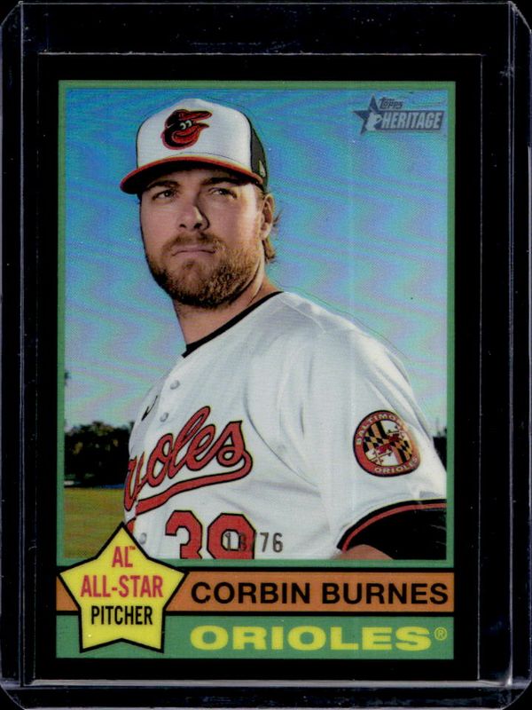 The Corbin Burnes 2025 Topps Heritage #140 Chrome - Black Refractor /76 card is 1 of 25 Corbin Burnes' card variations in the 2025 Topps Heritage set being tracked by Sports Card Investor, including Base, Black Border, Dark Blue Border, Dark Green Border, and Dark Yellow Border.