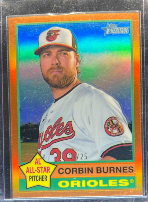 The Corbin Burnes 2025 Topps Heritage #140 Chrome - Orange Refractor /25 card is 1 of 25 Corbin Burnes' card variations in the 2025 Topps Heritage set being tracked by Sports Card Investor, including Base, Black Border, Dark Blue Border, Dark Green Border, and Dark Yellow Border.