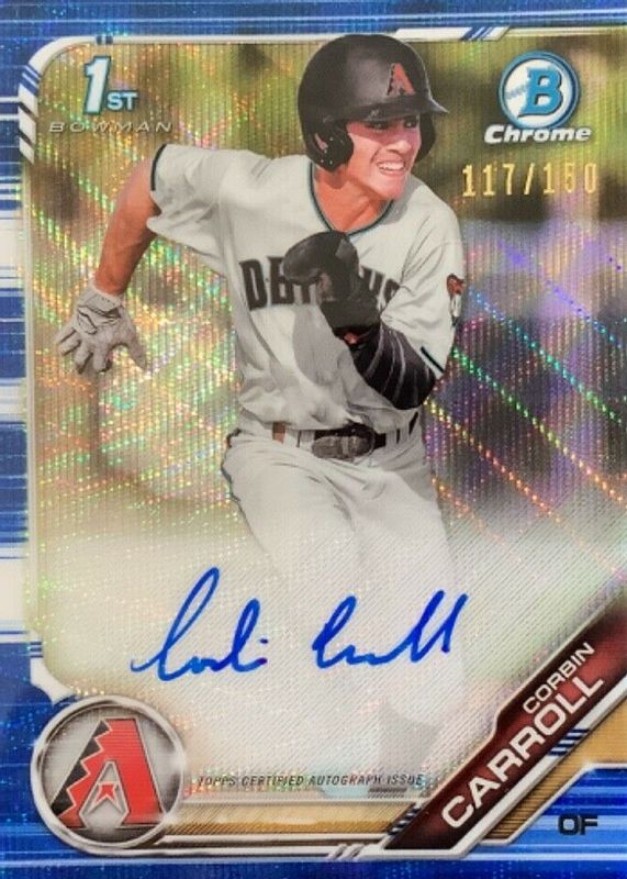 The Corbin Carroll 2019 Bowman Draft #CDA-CC Chrome DP Auto - Blue Wave Refractor /150 (1st) card in Raw condition has not changed in price in the last 30 days and was last sold for $504.00 .