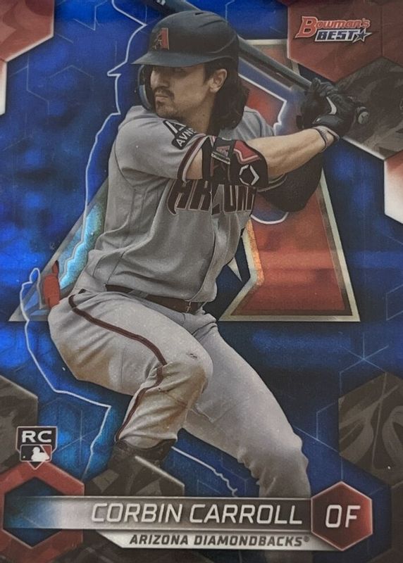 The Corbin Carroll 2023 Bowman's Best #20 Blue Refractor /150 Rookie card in Raw condition has moved up $14.49 (+263%) in the last 30 days and was last sold for $19.99 .