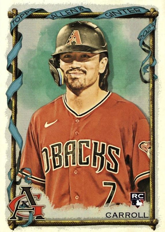 This card is 1 of 8 Corbin Carroll's card variations in the 2023 Topps Allen & Ginter set being tracked by Sports Card Investor, including Base, SP, Foil Filigree, Glossy /1, and Framed Mini Auto.