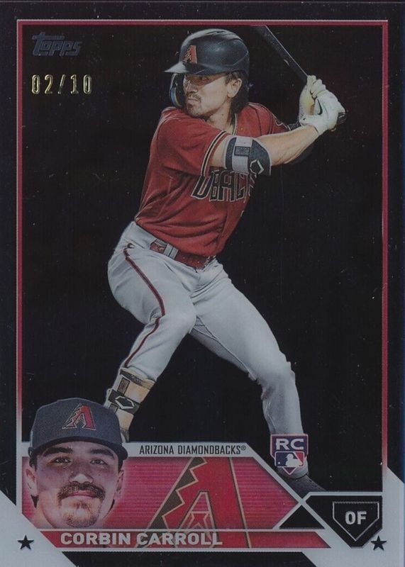 This card is 1 of 21 Corbin Carroll's card variations in the 2023 Topps set being tracked by Sports Card Investor, including Base, Gold Foil, Rainbow Foil, Royal Blue, and Gold /2023.
