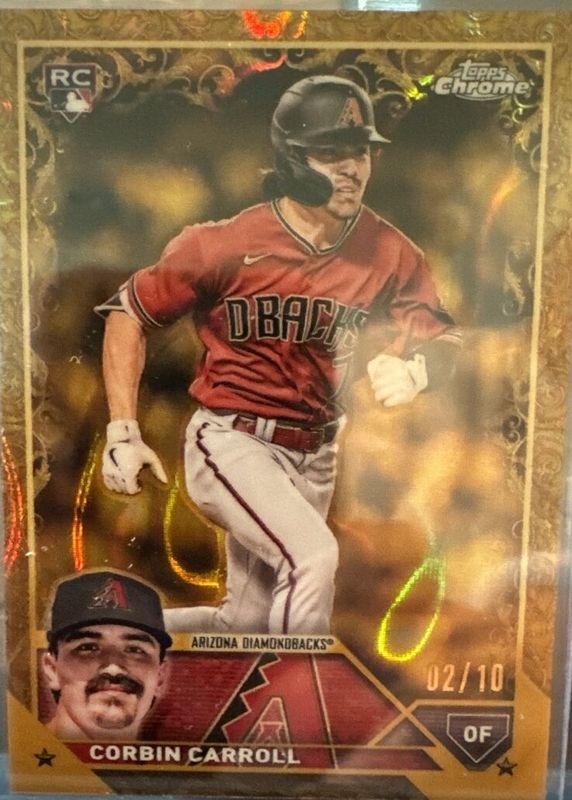 The Corbin Carroll 2023 Topps Gilded Collection #49 Lava Gold Etch Refractor /10 Rookie card in Raw condition has not changed in price in the last 30 days and was last sold for $420.00 .