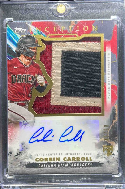 The Corbin Carroll 2023 Topps Inception #IAJP-CCA Inception Autographs Jumbo Patch - Red /50 Rookie card is 1 of 42 Corbin Carroll's card variations in the 2023 Topps Inception set being tracked by Sports Card Investor, including Base, Green, Purple /150, Magenta /99, and Red /75.