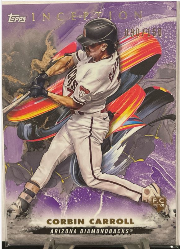 The Corbin Carroll 2023 Topps Inception #83 Purple /150 Rookie card is 1 of 42 Corbin Carroll's card variations in the 2023 Topps Inception set being tracked by Sports Card Investor, including Base, Green, Magenta /99, Red /75, and Orange /50.