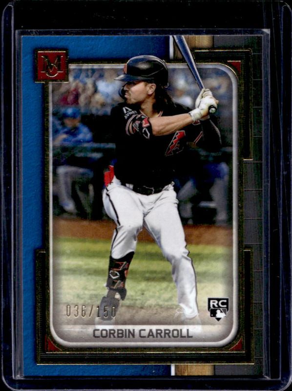 The Corbin Carroll 2023 Topps Museum Collection #63 Sapphire /150 Rookie card is 1 of 40 Corbin Carroll's card variations in the 2023 Topps Museum Collection set being tracked by Sports Card Investor, including Base, Copper, Gold /299, Amethyst /99, and Ruby /50.
