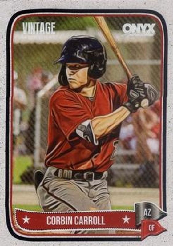 The Corbin Carroll 2024 Onyx Vintage #OVCOCA Base card is 1 of 20 Corbin Carroll's card variations in the 2024 Onyx Vintage set being tracked by Sports Card Investor, including #VACOCA Autographs, #VACCTT Autographs, #OVCOCA Yellow Bordered /150, #OVCOCA Aqua Bordered /99, and #OVCOCA Orange Bordered /75.