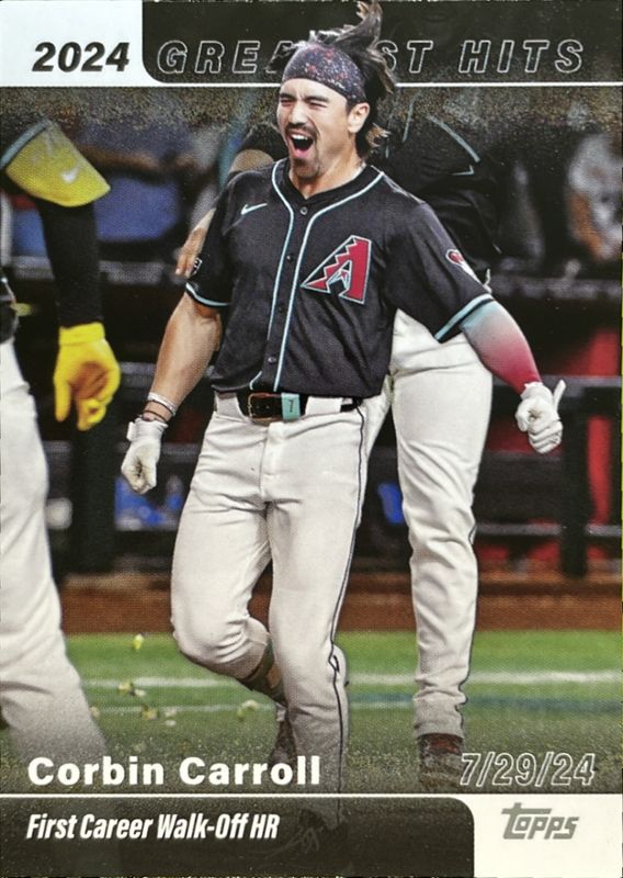 The Corbin Carroll 2025 Topps #GH-7 2024's Greatest Hits card is 1 of 262 Corbin Carroll's card variations in the 2025 Topps set being tracked by Sports Card Investor, including Base, Aqua Holo Foil, Diamante Foil, Holo Foil, and Pink Diamante Foil.