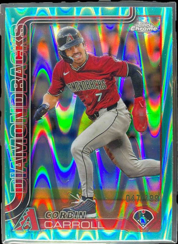 The Corbin Carroll 2025 Topps Chrome #268 Aqua RayWave Refractor /199 card is 1 of 90 Corbin Carroll's card variations in the 2025 Topps Chrome set being tracked by Sports Card Investor, including Base, Geometric Refractor, Image Variation, Lightboard Logo Variation, and Negative Refractor.