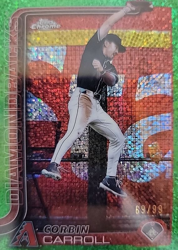 The Corbin Carroll 2025 Topps Chrome #268 Image Variation - Green Speckle Refractor /99 card in Raw condition has not changed in price in the last 30 days and was last sold for $65.00 .