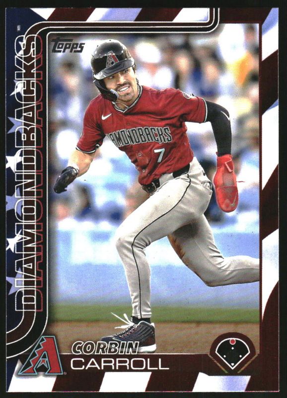 The Corbin Carroll 2025 Topps #78 Independence Day /76 card is 1 of 262 Corbin Carroll's card variations in the 2025 Topps set being tracked by Sports Card Investor, including Base, Aqua Holo Foil, Diamante Foil, Holo Foil, and Pink Diamante Foil.