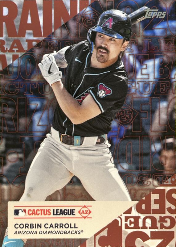 The Corbin Carroll 2025 Topps #TG-15 Training Grounds card is 1 of 262 Corbin Carroll's card variations in the 2025 Topps set being tracked by Sports Card Investor, including Base, Aqua Holo Foil, Diamante Foil, Holo Foil, and Pink Diamante Foil.