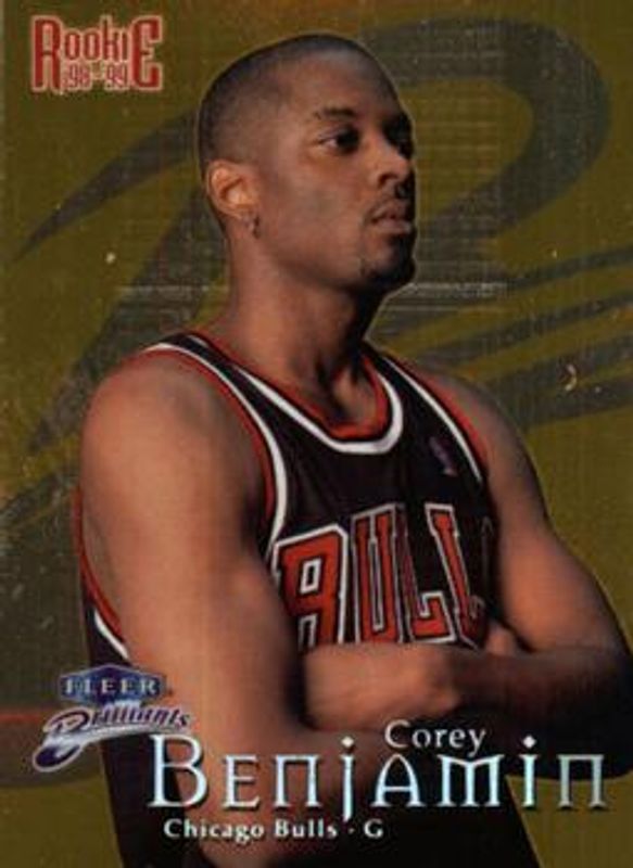 The Corey Benjamin 1998 Fleer Brilliants #123G Gold /99 Rookie card is 1 of 5 Corey Benjamin's card variations in the 1998 Fleer Brilliants set being tracked by Sports Card Investor, including Base, Blue, Illuminators, and 24-Karat Gold /24.