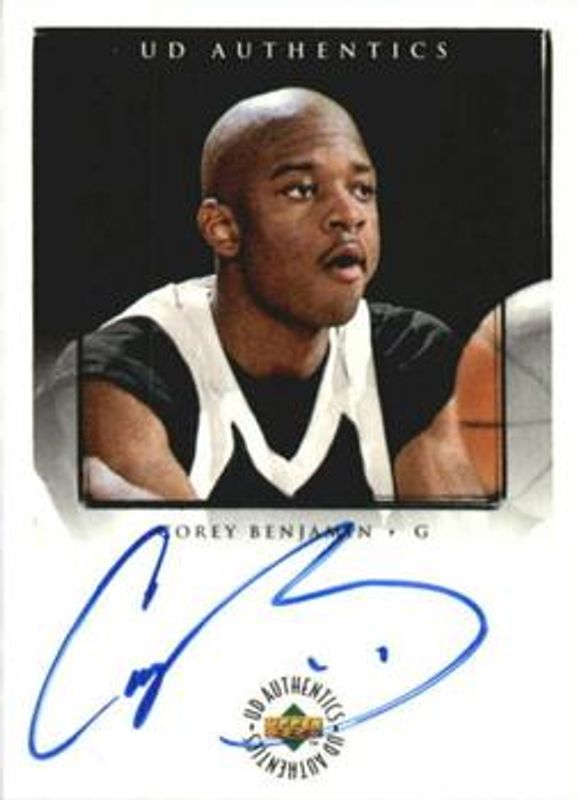 The Corey Benjamin 1998 Upper Deck Ionix #CB UD Authentics Rookie card is 1 of 3 Corey Benjamin's card variations in the 1998 Upper Deck Ionix set being tracked by Sports Card Investor, including Base, and Reciprocal /100.