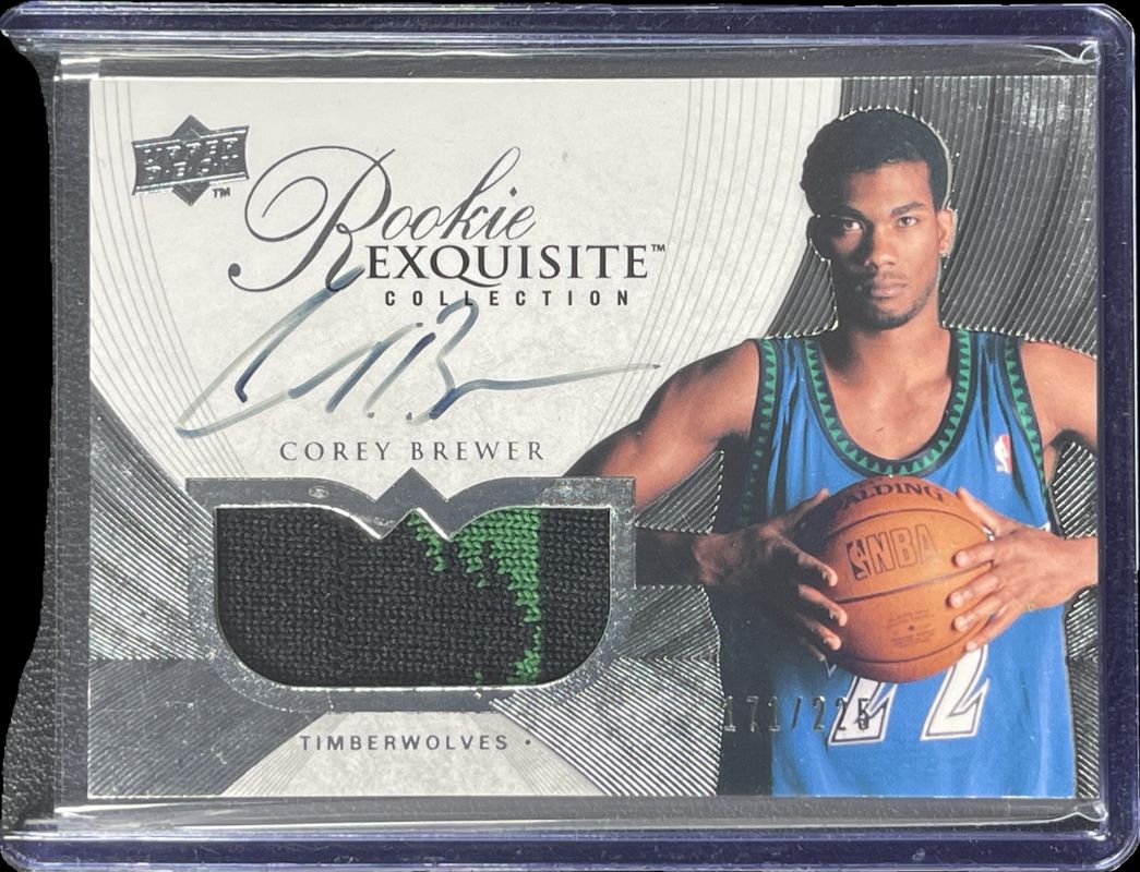 The Corey Brewer 2007 Upper Deck Exquisite Collection #72 Base /99 Rookie card is 1 of 14 Corey Brewer's card variations in the 2007 Upper Deck Exquisite Collection set being tracked by Sports Card Investor, including Gold /25, Black /1, Press Plates Black /1, Press Plates Cyan /1, and Press Plates Magenta /1.
