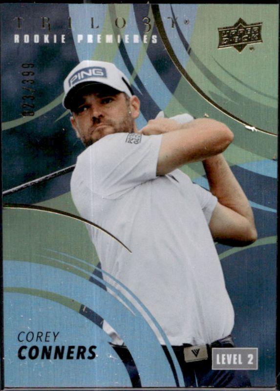The Corey Conners 2024 Upper Deck Portfolio #25 Trilogy /899 Rookie card is 1 of 64 Corey Conners' card variations in the 2024 Upper Deck Portfolio set being tracked by Sports Card Investor, including Color Portraits, Wire Photos, Allure Black Rainbow Parallel Rookies, Allure Green Rainbow Parallel Rookies, and Allure Rookies.