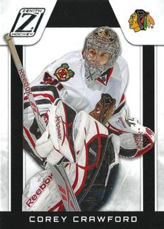 The Corey Crawford 2010 Zenith #107 Base /999 card is 1 of 8 Corey Crawford's card variations in the 2010 Zenith set being tracked by Sports Card Investor, including Red Hot, White Hot /25, Chasing the Cup, Crease is the Word, and Rookie Roll Call.