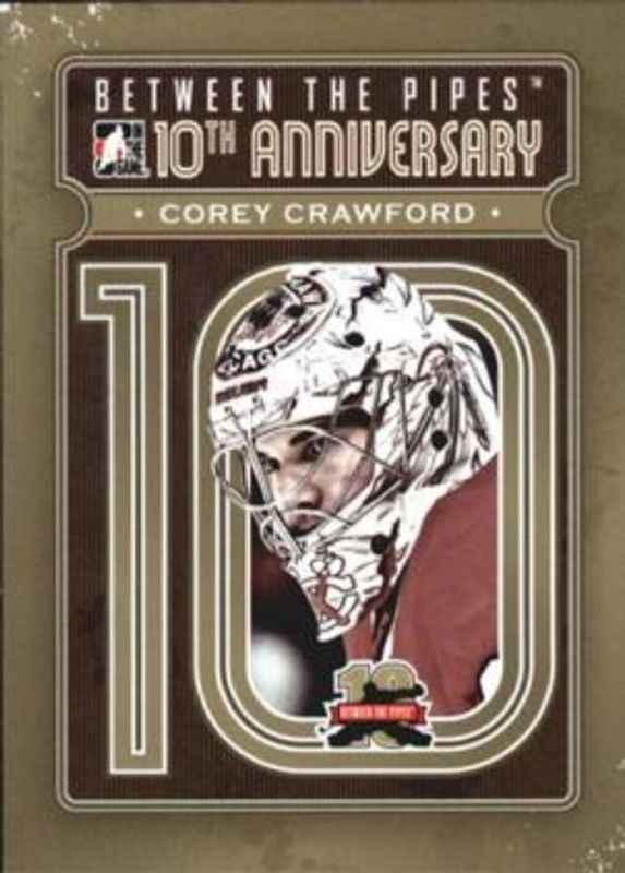 The Corey Crawford 2011 In The Game Between the Pipes #BTPA-06 10th Anniversary card is 1 of 11 Corey Crawford's card variations in the 2011 In The Game Between the Pipes set being tracked by Sports Card Investor, including #174 Base, #70 Base, #A-CC Authentic Goaliegraph, #A-CC2 Authentic Goaliegraph, and #MMA-CC Masked Men Autographs.