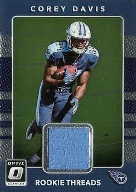 The Corey Davis 2017 Optic #3 Rookie Threads card is 1 of 62 Corey Davis' card variations in the 2017 Optic set being tracked by Sports Card Investor, including Base, Bronze, Holo, Lime, and Pink.