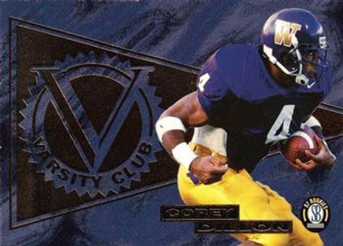 The Corey Dillon 1997 Score Board Rookies #V8 Varsity Club card is 1 of 5 Corey Dillon's card variations in the 1997 Score Board Rookies set being tracked by Sports Card Investor, including #18 Base, #18 Dean's List, #W4 War Room, and #WR4 War Room.