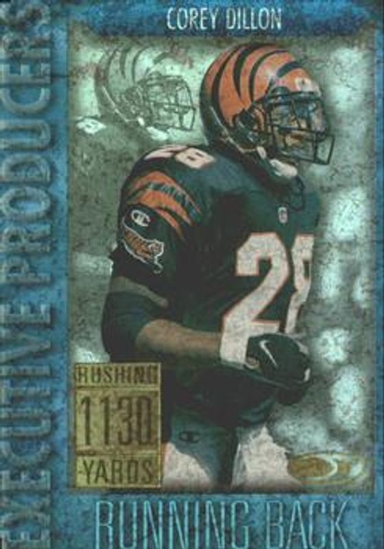 The Corey Dillon 1999 Donruss #EP1-19 Executive Producers /3497 card is 1 of 5 Corey Dillon's card variations in the 1999 Donruss set being tracked by Sports Card Investor, including Base, Stat Line Career /223, Stat Line Season /14, and Private Signings.