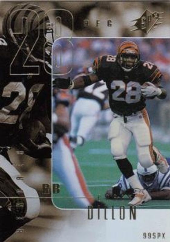 The Corey Dillon 1999 SPx #19 Base /1999 card is 1 of 5 Corey Dillon's card variations in the 1999 SPx set being tracked by Sports Card Investor, including Radiance /100, Spectrum /1, SPxtreme, and Starscape.