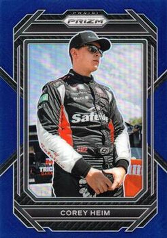 The Corey Heim 2023 Prizm NASCAR #10 Blue /499 card is 1 of 32 Corey Heim's card variations in the 2023 Prizm NASCAR set being tracked by Sports Card Investor, including Base, Hyper Blue & Carolina Blue, Hyper Purple & Yellow, Reactive Orange, and Red.