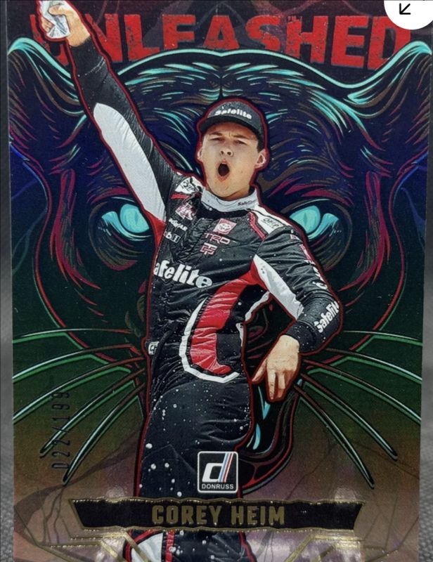 The Corey Heim 2025 Donruss NASCAR #12 Unleashed - Holo /199 card is 1 of 64 Corey Heim's card variations in the 2025 Donruss NASCAR set being tracked by Sports Card Investor, including Base, Laser, Red /299, Blue /199, and Lime Green /199.