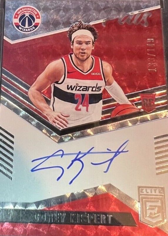This card is 1 of 16 Corey Kispert's card variations in the 2021 Elite set being tracked by Sports Card Investor, including Base Rookie /999, Asia Exclusive, Asia Hyper Gold, Asia Hyper Red, and Aspirations (/76).