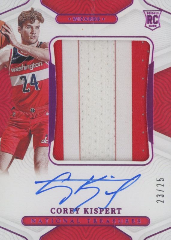 This card is 1 of 10 Corey Kispert's card variations in the 2021 National Treasures set being tracked by Sports Card Investor, including Rookie Patch Auto - Bronze (/49), Rookie Patch Auto - NBA 75th (/75), Rookie Patch Auto /99, Rookie Patch Auto - Gold FOTL /24, and Rookie Patch Auto - Gold /10.