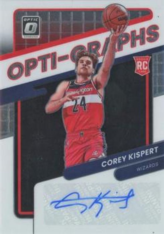 The Corey Kispert 2021 Optic #OG-CKP Opti Graphs /25 Rookie card is 1 of 82 Corey Kispert's card variations in the 2021 Optic set being tracked by Sports Card Investor, including Base, Blue Pulsar, Blue Velocity, Checkerboard, and Choice.