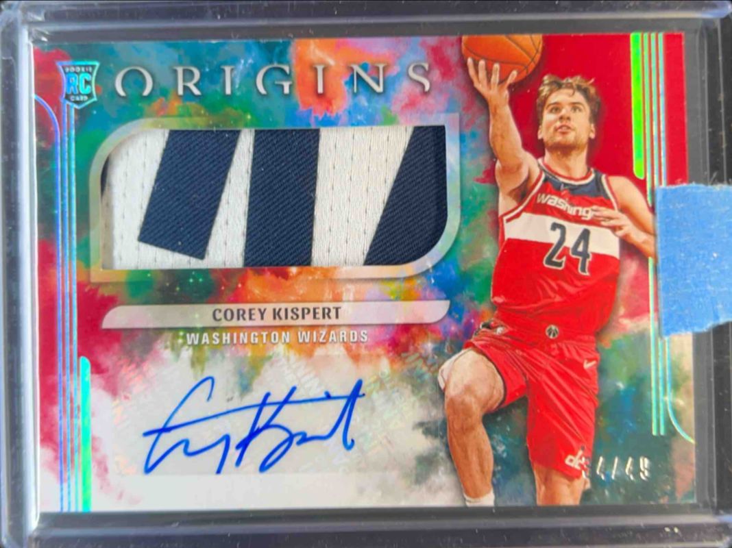 The Corey Kispert 2021 Origins #JA-KIS Rookie Jersey Autographs - Red /49 card is 1 of 39 Corey Kispert's card variations in the 2021 Origins set being tracked by Sports Card Investor, including Base, Red, Blue /99, Orange /75, and Pink /60.