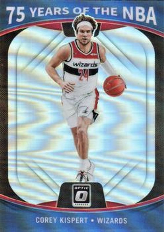 The Corey Kispert 2021 Prizm #48 75 Years of the NBA Rookie card is 1 of 97 Corey Kispert's card variations in the 2021 Prizm set being tracked by Sports Card Investor, including Base, Blue NBA 75th Anniversary, Blue Wave, Choice Blue Yellow Green, and Factory Set Blue Hyper.