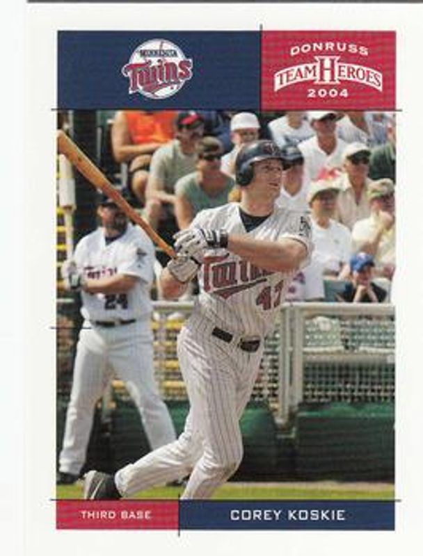 The Corey Koskie 2004 Donruss Team Heroes #240 Base card is 1 of 4 Corey Koskie's card variations in the 2004 Donruss Team Heroes set being tracked by Sports Card Investor, including Showdown - Bronze /150, Showdown - Silver /50, and Showdown - Gold /10.