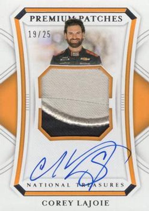 The Corey LaJoie 2021 National Treasures NASCAR #PP-CL Premium Patches /25 card is 1 of 71 Corey LaJoie's card variations in the 2021 National Treasures NASCAR set being tracked by Sports Card Investor, including Base /10, Holo Silver /7, Holo Gold /5, Holo Platinum Blue /1, and Three Wide /50.