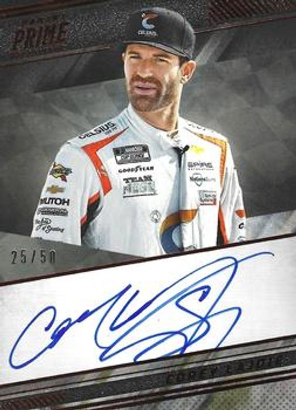 The Corey LaJoie 2023 Panini Prime #PS-CLJ Prime Signatures - Red /50 card is 1 of 51 Corey LaJoie's card variations in the 2023 Panini Prime set being tracked by Sports Card Investor, including Base /49, Holo Gold /25, Holo Silver /10, Purple /5, and Holo Platinum Blue /1.