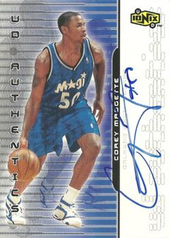The Corey Maggette 1999 Upper Deck Ionix #CM UD Authentics Rookie card is 1 of 4 Corey Maggette's card variations in the 1999 Upper Deck Ionix set being tracked by Sports Card Investor, including Base /3500, Reciprocal /100, and Awesome Powers.