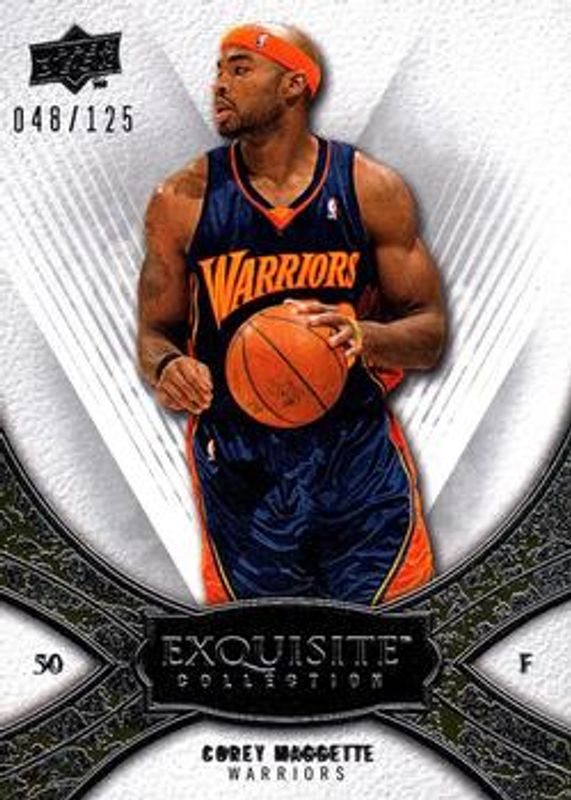 The Corey Maggette 2008 Upper Deck Exquisite Collection #45 Base /125 card is 1 of 12 Corey Maggette's card variations in the 2008 Upper Deck Exquisite Collection set being tracked by Sports Card Investor, including Gold /50, Black /1, Printing Plate Black /1, Printing Plate Cyan /1, and Printing Plate Magenta /1.