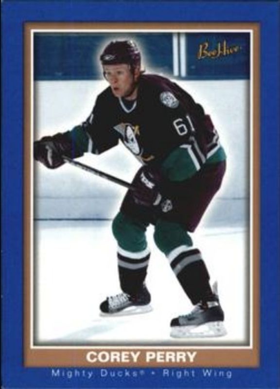The Corey Perry 2005 Upper Deck Beehive #104 Blue Rookie card is 1 of 9 Corey Perry's card variations in the 2005 Upper Deck Beehive set being tracked by Sports Card Investor, including Base, Beige, Gold, Red, and Matte /25.