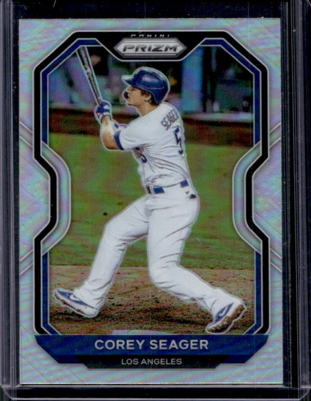 The Corey Seager 2021 Prizm #100 Silver card is 1 of 53 Corey Seager's card variations in the 2021 Prizm set being tracked by Sports Card Investor, including Base, Blue, Blue Velocity, Carolina Blue, and Cosmic Haze.