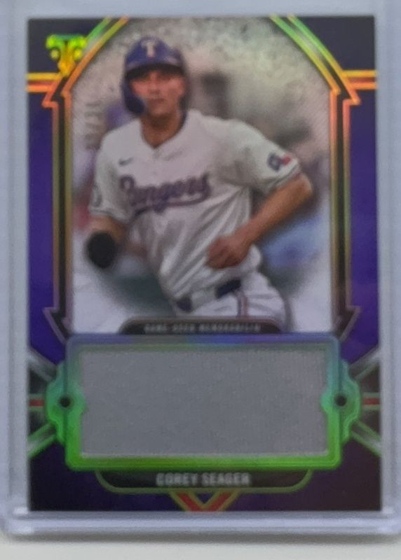 The Corey Seager 2024 Topps Triple Threads #SJR-CSE Single Jumbo Relics - Amethyst /36 card is 1 of 104 Corey Seager's card variations in the 2024 Topps Triple Threads set being tracked by Sports Card Investor, including Base, Amber /199, Aquamarine /149, Tourmaline /125, and Gold /99.