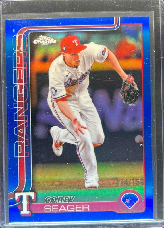 The Corey Seager 2025 Topps Chrome #24 Blue Refractor /150 card is 1 of 99 Corey Seager's card variations in the 2025 Topps Chrome set being tracked by Sports Card Investor, including Base, Geometric Refractor, Image Variation, Lightboard Logo Variation, and Negative Refractor.