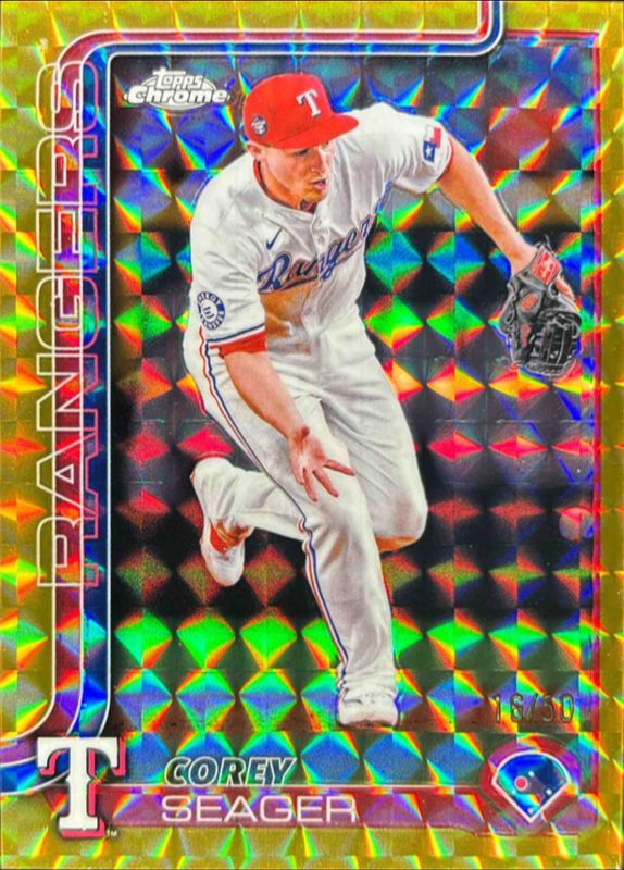 The Corey Seager 2025 Topps Chrome #24 Gold Geometric Refractor /50 card is 1 of 99 Corey Seager's card variations in the 2025 Topps Chrome set being tracked by Sports Card Investor, including Base, Geometric Refractor, Image Variation, Lightboard Logo Variation, and Negative Refractor.