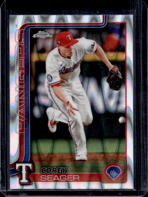 The Corey Seager 2025 Topps Chrome #24 RayWave Refractor card is 1 of 99 Corey Seager's card variations in the 2025 Topps Chrome set being tracked by Sports Card Investor, including Base, Geometric Refractor, Image Variation, Lightboard Logo Variation, and Negative Refractor.