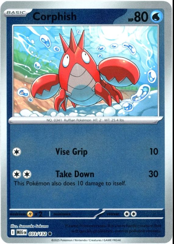 Corphish 2025 Mega Evolution #033/132 Reverse Holo RAW TCG (LIGHTLY PLAYED) Price Guide