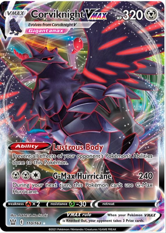 The Corviknight VMAX 2021 Sword & Shield: Battle Styles #110/163 Holo card in Raw TCG (Near Mint) condition has moved up $0.97 (+65.6%) in the last 30 days and was last sold for $2.44 .