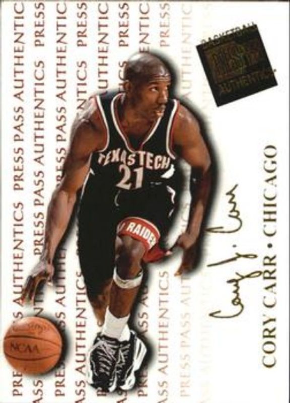 The Cory Carr 1998 Press Pass Authentics #32 Base Rookie card is 1 of 4 Cory Carr's card variations in the 1998 Press Pass Authentics set being tracked by Sports Card Investor, including Hang Time, Autographs, and Sterling Autographs /10.