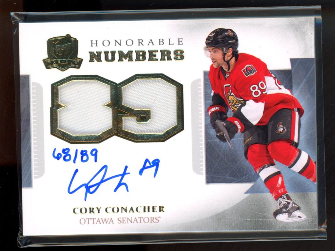 The Cory Conacher 2013 Upper Deck The Cup #HN-CC Honorable Numbers /16 Rookie card is 1 of 64 Cory Conacher's card variations in the 2013 Upper Deck The Cup set being tracked by Sports Card Investor, including Base /249, Gold Rookie Autographed Patch /58, Gold Rainbow /25, Gold /14, and Black Laundry Tags /3.
